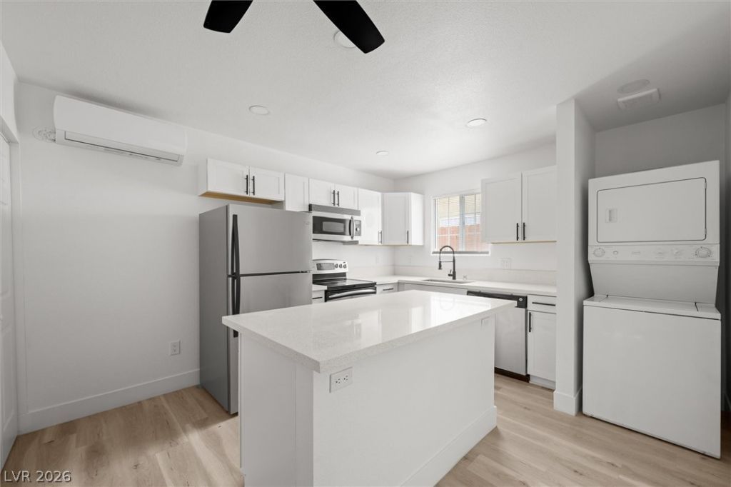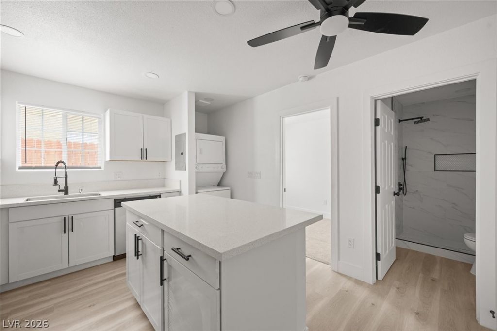 Welcome home to this beautifully remodeled 1-bedroom unit in a turnkey fourplex, where modern design meets everyday convenience. Step inside to an open-concept layout featuring stylish laminate flooring, recessed lighting, and a bright, contemporary feel throughout. The upgraded kitchen is designed to impress with white shaker cabinets, quartz countertops, and stainless steel appliances?including a refrigerator, range, microwave, and in-unit stacked washer & dryer for added convenience.. The bathrooms have been thoughtfully updated with a sleek vanity and tiled shower, giving it a clean, modern finish. Enjoy peace of mind knowing the entire property has been upgraded with a new roof, windows, doors, and driveway, and a freshly painted exterior with crisp white walls and bold black trim for a sharp, modern look. This unit is Appx 400 Sq ft